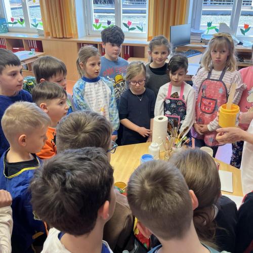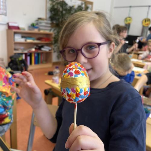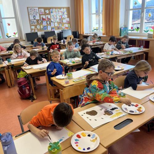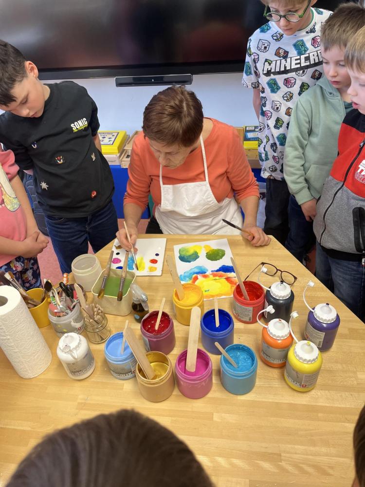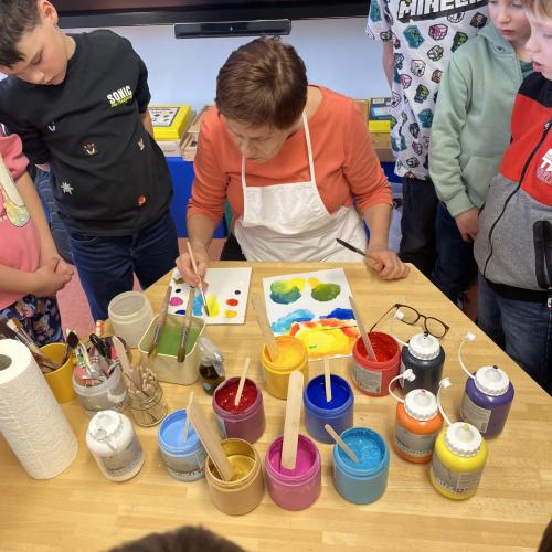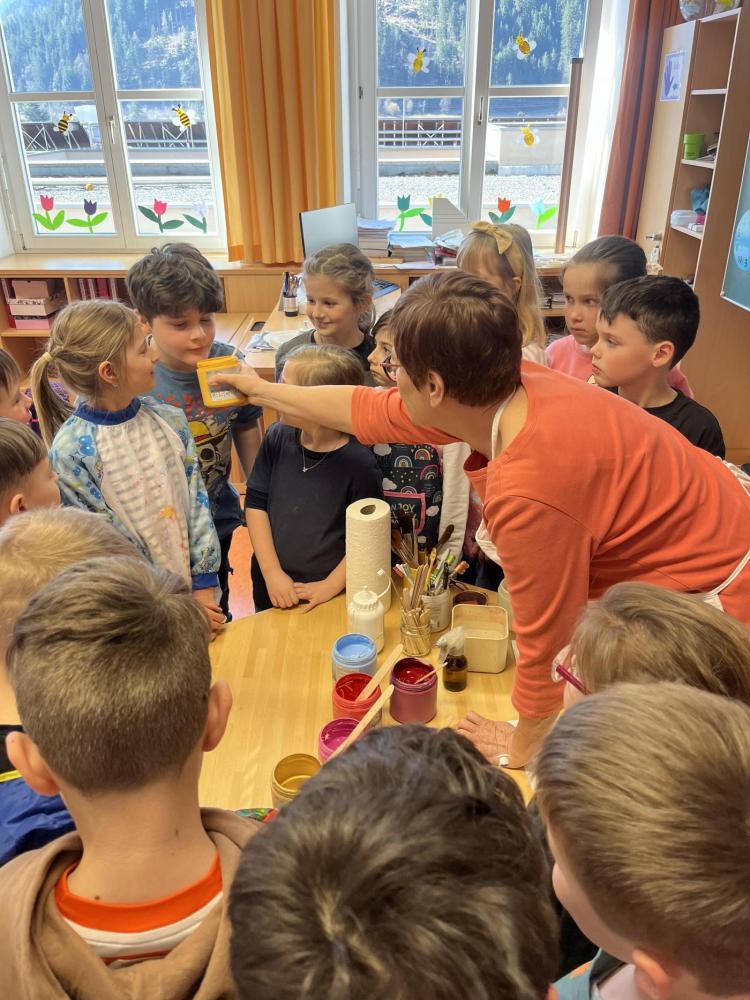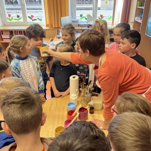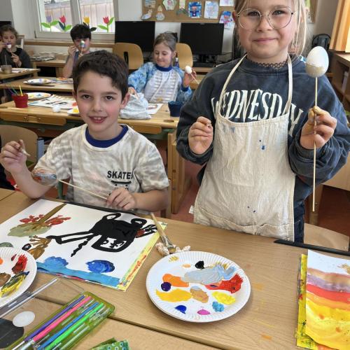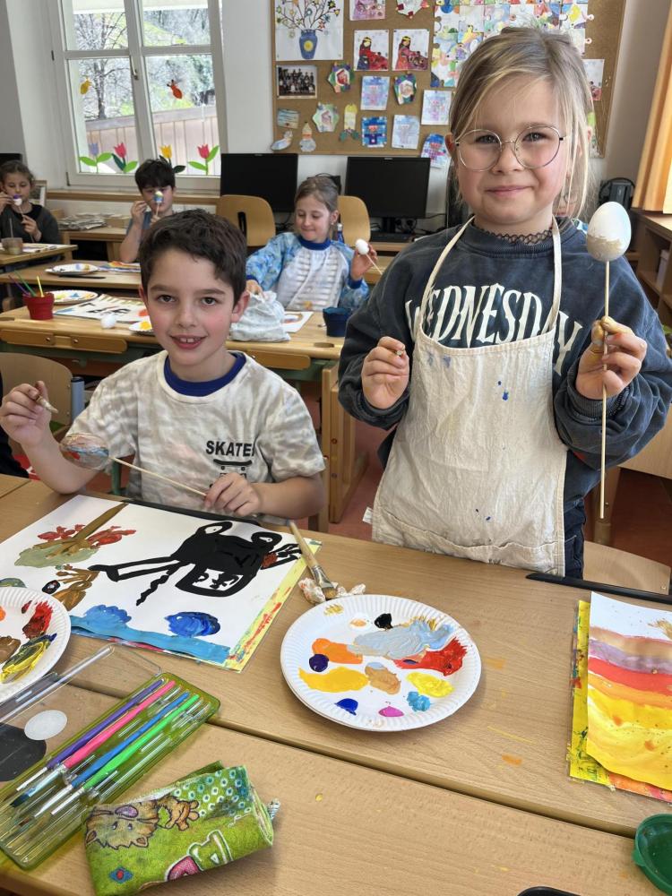 Gemeinsam mit einer Künstlerin arbeiteten die Kinder mit hochwertigen Gouachefarben und tauchten in die Welt der Farben ein. Mit großer Freude mischten sie eigene Farbtöne und probierten verschiedene Techniken aus. Dabei entstanden ganz individuelle und kreative Ergebnisse. Passend zur Osterzeit wurden die selbst gemischten Farben zum Bemalen von Ostereiern verwendet.